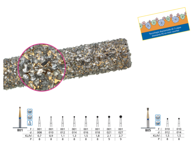 Todos los instrumentos diamantados DFS Diamon cuentan con un recubrimiento de diamante multicapa, con cada capa incrustada individualmente. El uso exclusivo de diamante natural en todos los tamaños de grano relevantes garantiza una eficiencia de corte superior, junto con una durabilidad excepcional. Como resultado, el usuario experimentará ventajas prácticas y beneficios económicos.